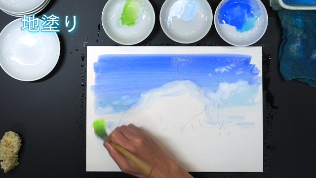 アニメーション背景美術を支え続けているニッカーポスターカラーを用いての手描き背景画の制作過程をご覧いただけます。