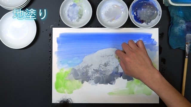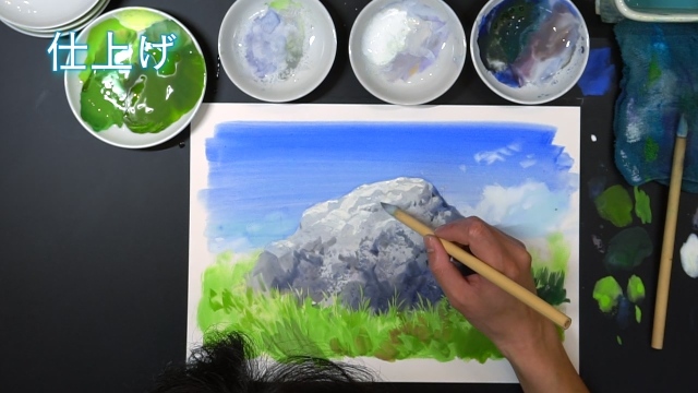 風景に欠かせない要素となることもある「岩」の描き方です。筆だけでなくスポンジも使って岩のテクスチャーを作り上げていきます。