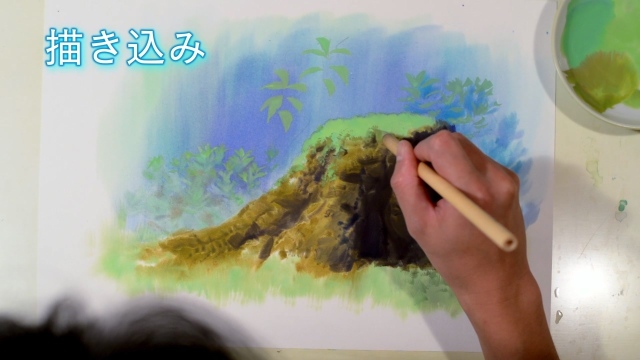 アニメーション背景美術を支え続けているニッカーポスターカラーを用いての手描き背景画の制作過程をご覧いただけます。
