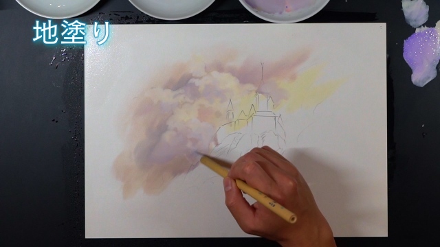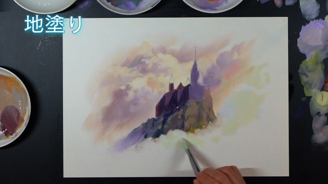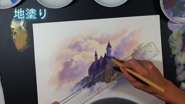 雲の中に浮かぶようにそびえる、幻想的な城の背景画の制作工程です。