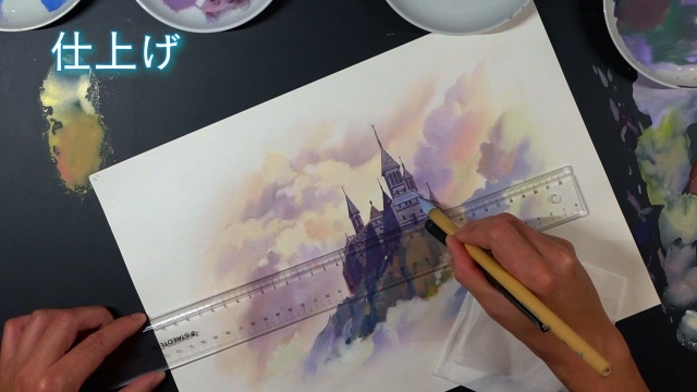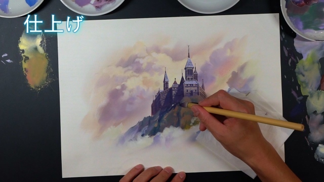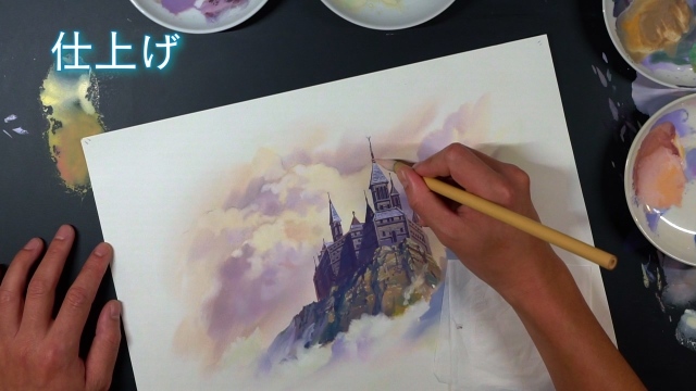 雲の中に浮かぶようにそびえる、幻想的な城の背景画の制作工程です。