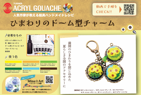 アクリルガッシュとレジンで作る ひまわりのドーム型チャーム ターナー色彩スズキ 再生時間:01分22秒 公開日:2025年10月1日 質問:質問を受け付ける 言語:日本語 字幕:字幕有り 年齢制限:年齢制限無し 価格:無料 視聴ページへ 内容紹介 道具 レビュー 内容紹介 アクリルガッシュとレジンを使ったひまわりのドーム型チャームの作り方講座です。 人気作家のMina☆Artさんに監修してもらいました。 作家リンク:https://x.com/MinaArt3 作家情報:レジンの透明な特性を生かしながら色々の描き方にて絵を立体的に仕上げるレジンアート作家。小さな中に広い世界が描きたくて試行錯誤しながら表現しています。ぜひ不思議な立体絵画を見ていただけたら嬉しいです。 利用する道具 ・ターナーアクリルガッシュ #10 パーマネントレモン #12 パーマネントイエローディープ #37 バーントアンバー #41 パーマネントイエローグリーン #43 パーマネントグリーンミドル #151 アクアブルー ・LEDレジン液&ランプ ・筆(細め)&ハサミ ・ドーム型シリコンモールド ・ブローチフレーム ・接着剤