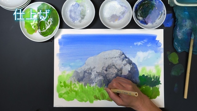 風景に欠かせない要素となることもある「岩」の描き方です。筆だけでなくスポンジも使って岩のテクスチャーを作り上げていきます。