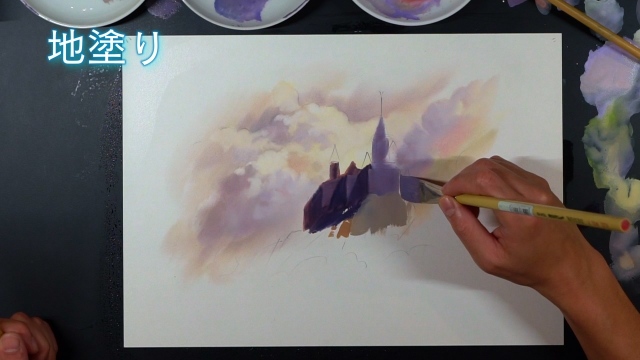 雲の中に浮かぶようにそびえる、幻想的な城の背景画の制作工程です。