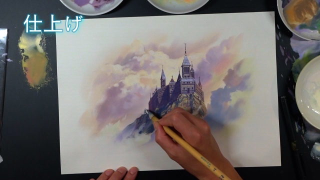 雲の中に浮かぶようにそびえる、幻想的な城の背景画の制作工程です。