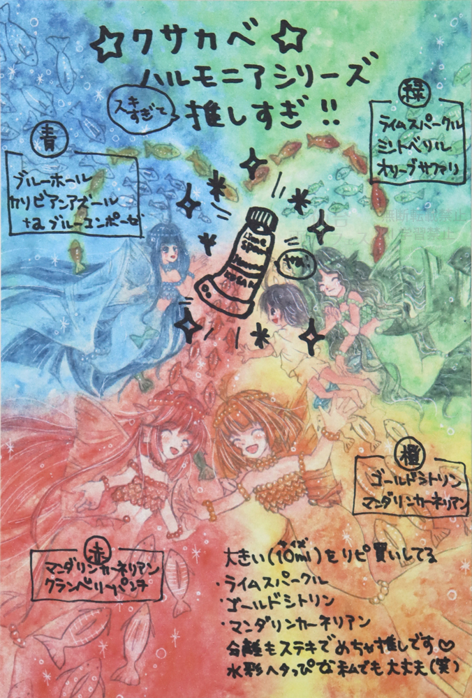 「この画材をみんなにもぜひ使って欲しい!」「こんな風に自分は使っている」「この色が本当に好き!」「この画材がないと始まらない!」など。