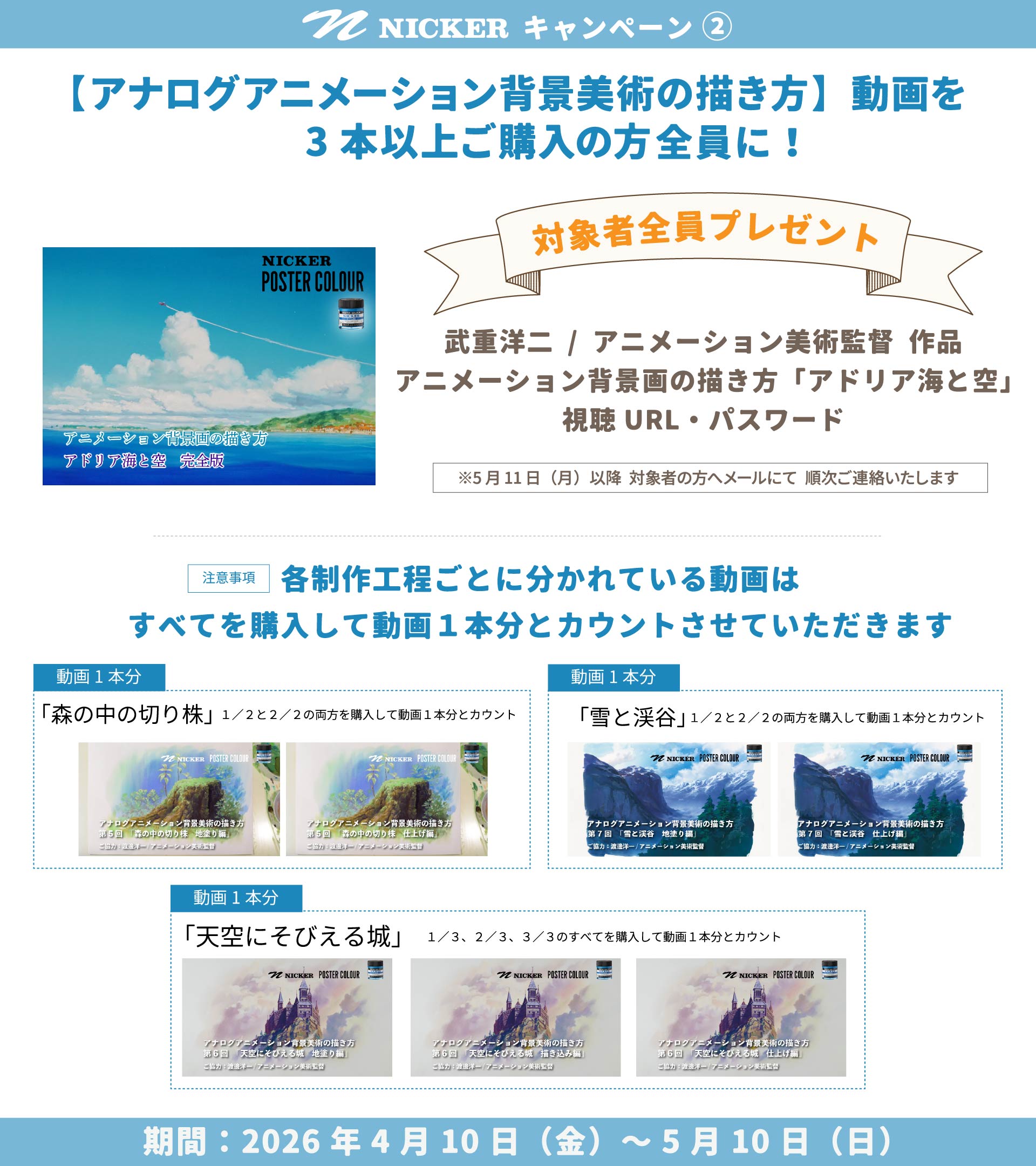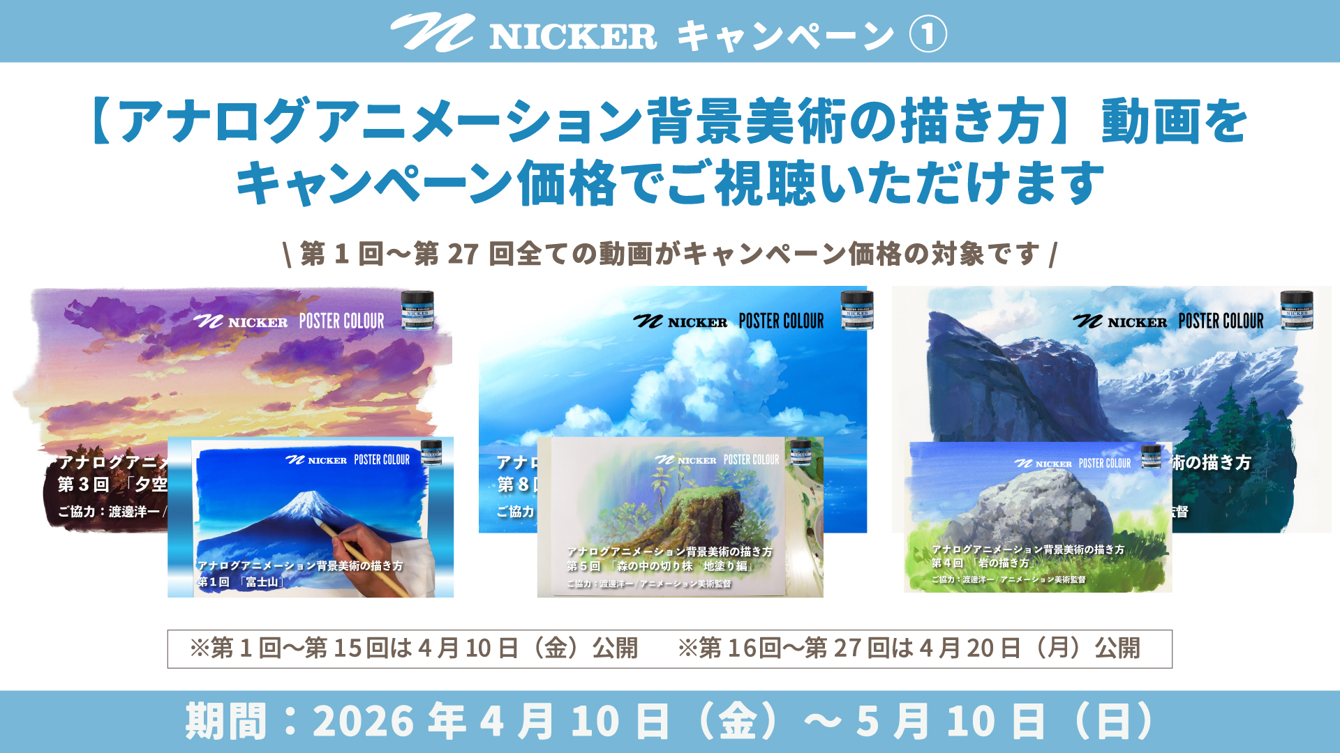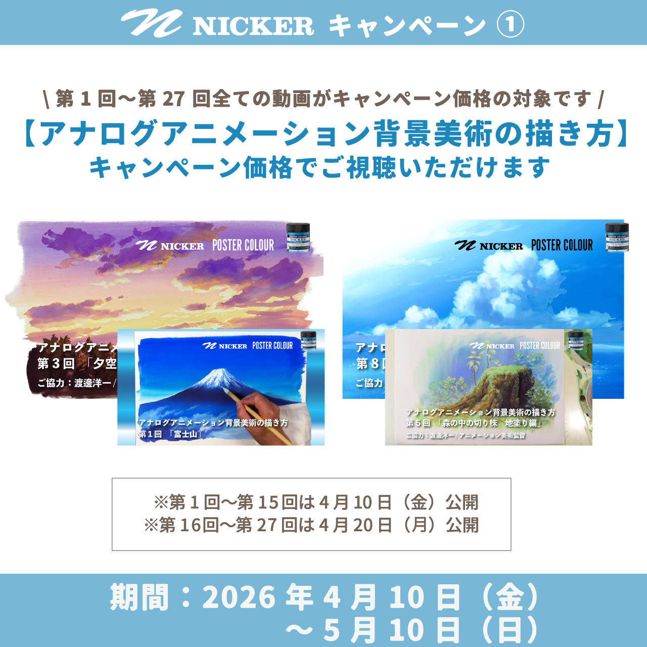 ニッカー絵具 アナログアニメーション背景美術の描き方動画公開記念として期間中はキャンペーン価格で動画を販売しております。4月10日(金)に15講座、4月20日(月)に12講座と2日に分けて公開します。この期間をお見逃し無く!