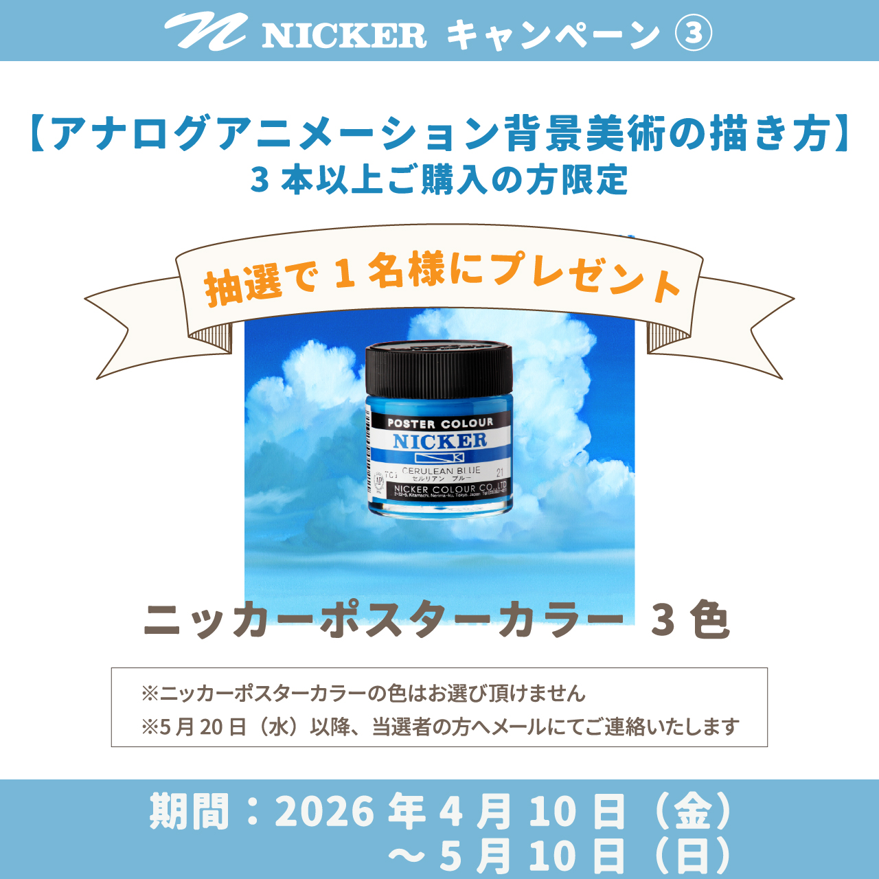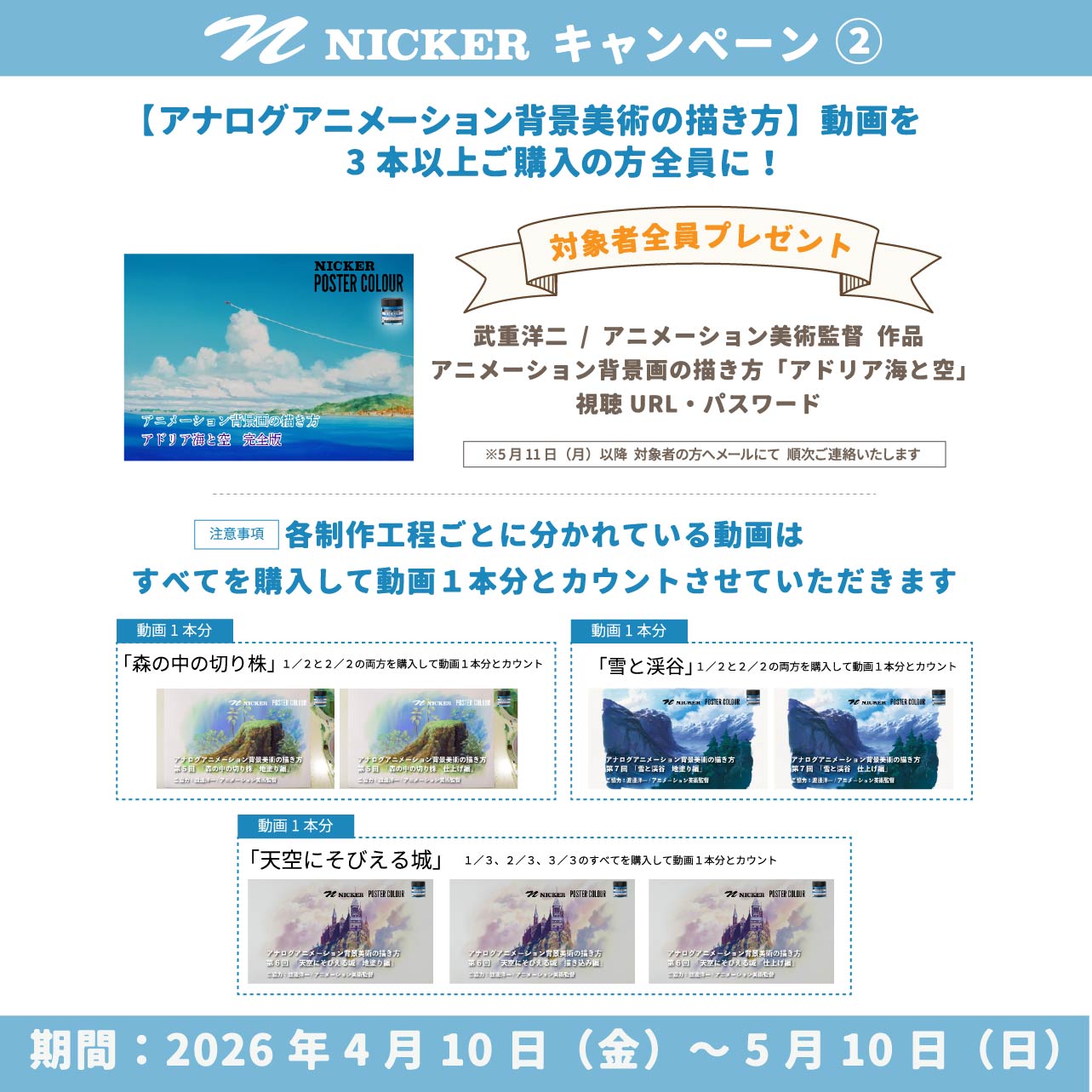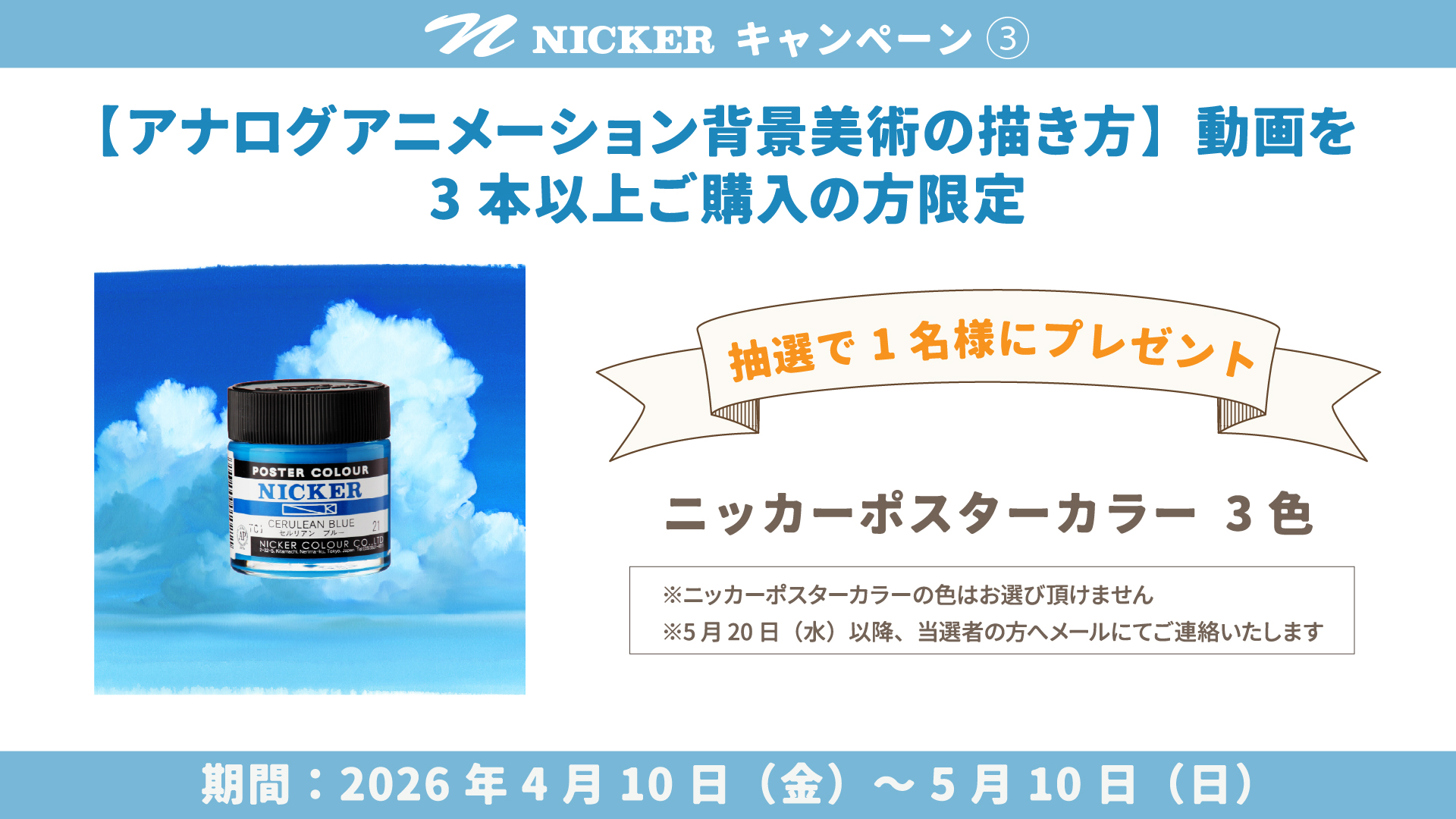 ニッカー絵具 アナログアニメーション背景美術の描き方動画公開記念として期間中はキャンペーン価格で動画を販売しております。4月10日(金)に15講座、4月20日(月)に12講座と2日に分けて公開します。この期間をお見逃し無く!