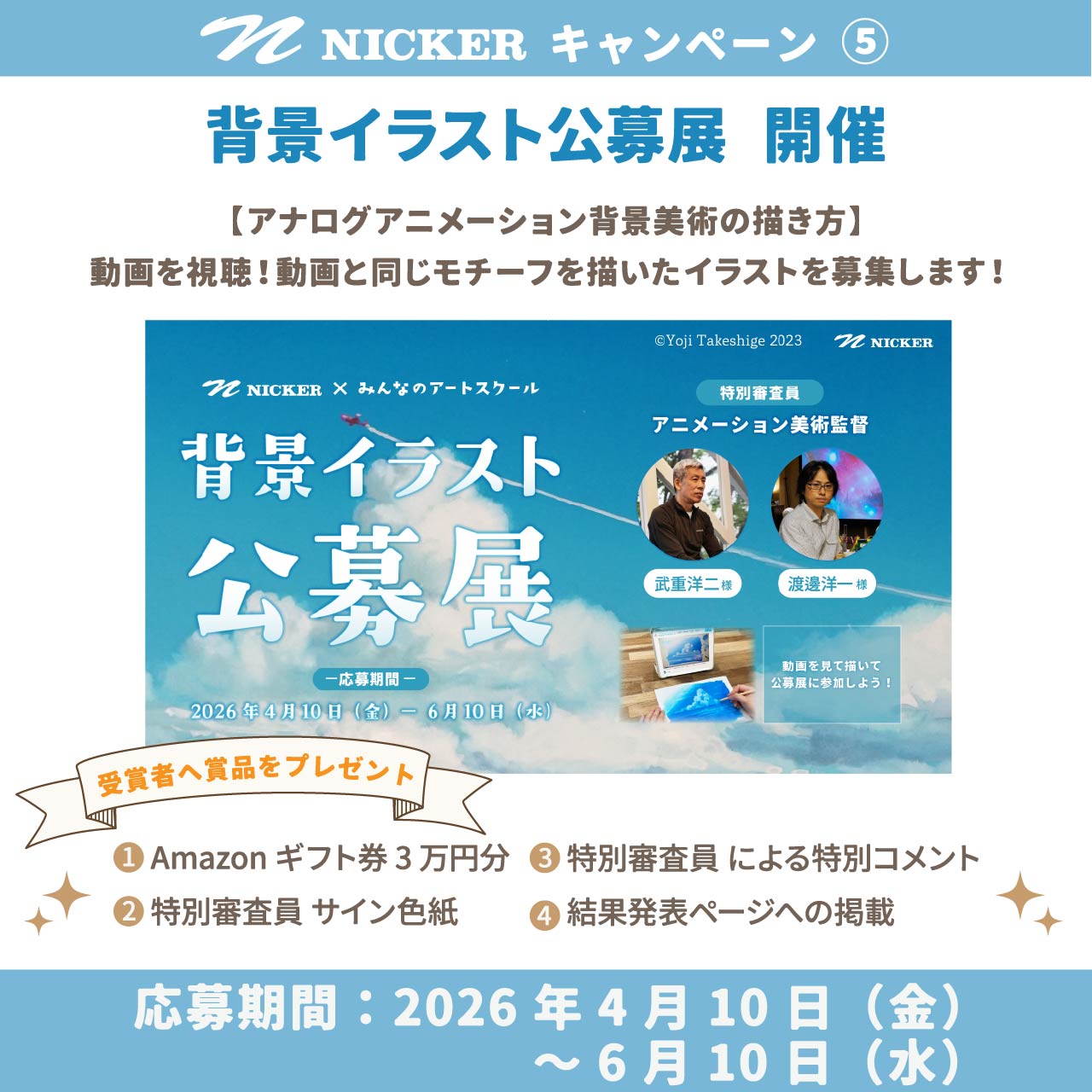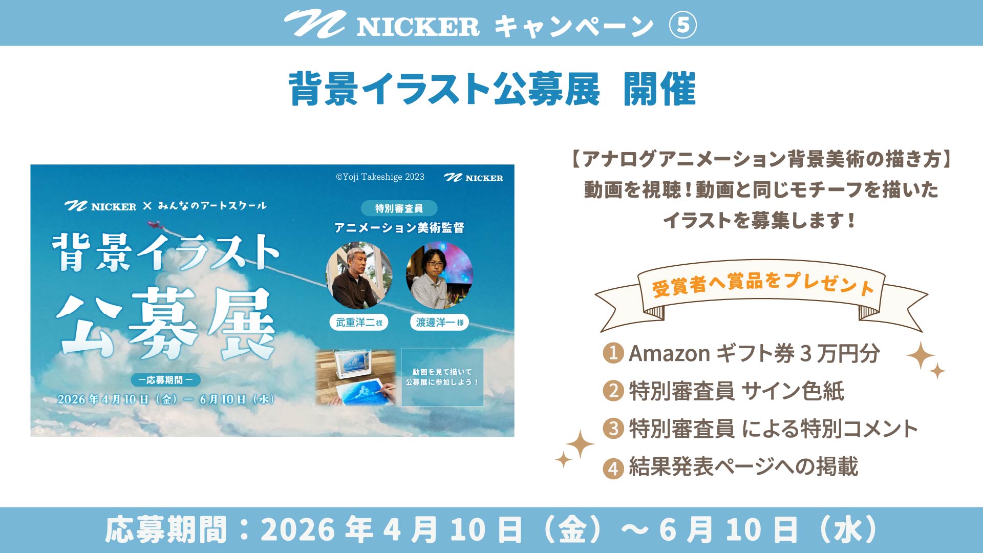 対象動画を視聴し、動画と同じモチーフを描く公募展です。審査員には数々にアニメーション背景を手掛けてきた武重洋二氏と渡邊洋一氏をお迎えし、審査員賞はAmazonギフト券、審査員のサイン色紙、審査員による特別コメントが授与されます。動画を見て描いて公募展に参加しよう!