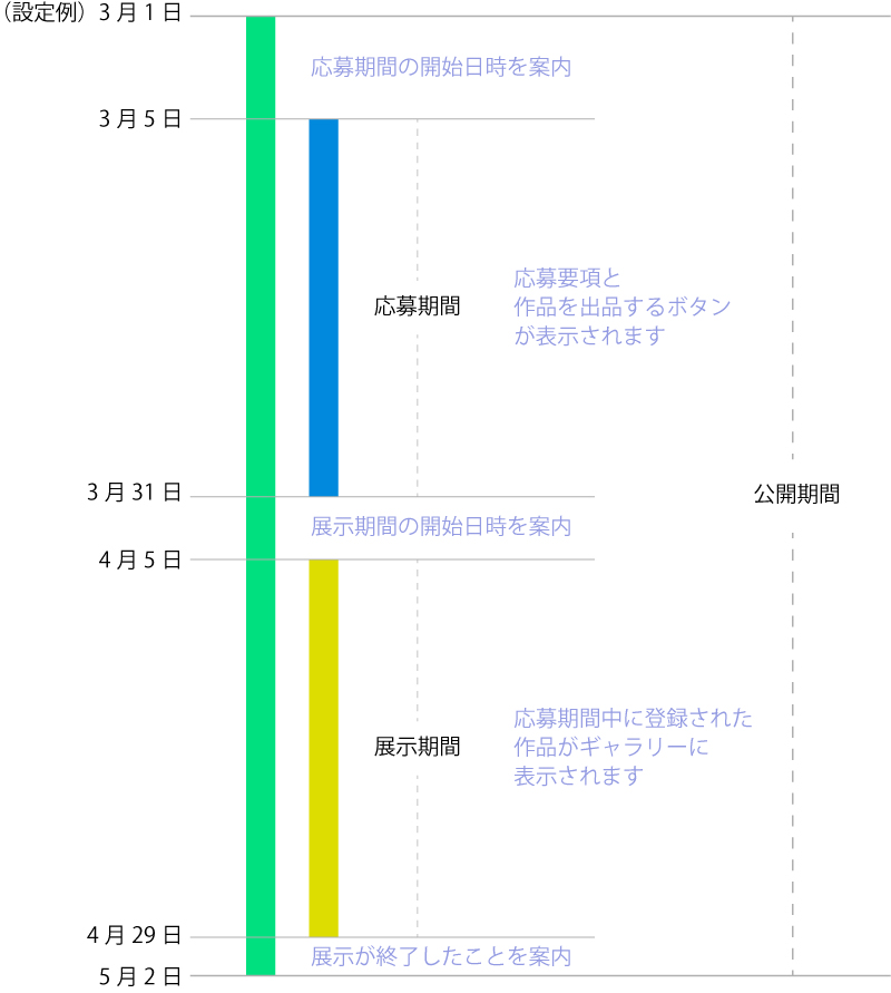 公開期間、応募期間、展示期間の3つの期間を指定することができます。公開期間中に展示会ページが表示され、応募、展示は設定した日時で始まりと終わりが自動で切り替わります。